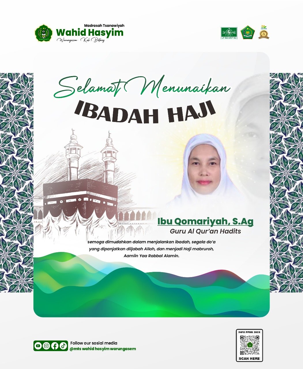 Keluarga besar MTs Wahid Hasyim dengan penuh rasa syukur dan bangga mengucapkan Selamat Menunaikan Ibadah Haji kepada Ibu Qomariyah, S.Ag., guru mata pelajaran Al-Qur’an Hadis, yang berangkat ke Tanah Suci pada musim haji tahun ini, 1446 H / 2025 M.